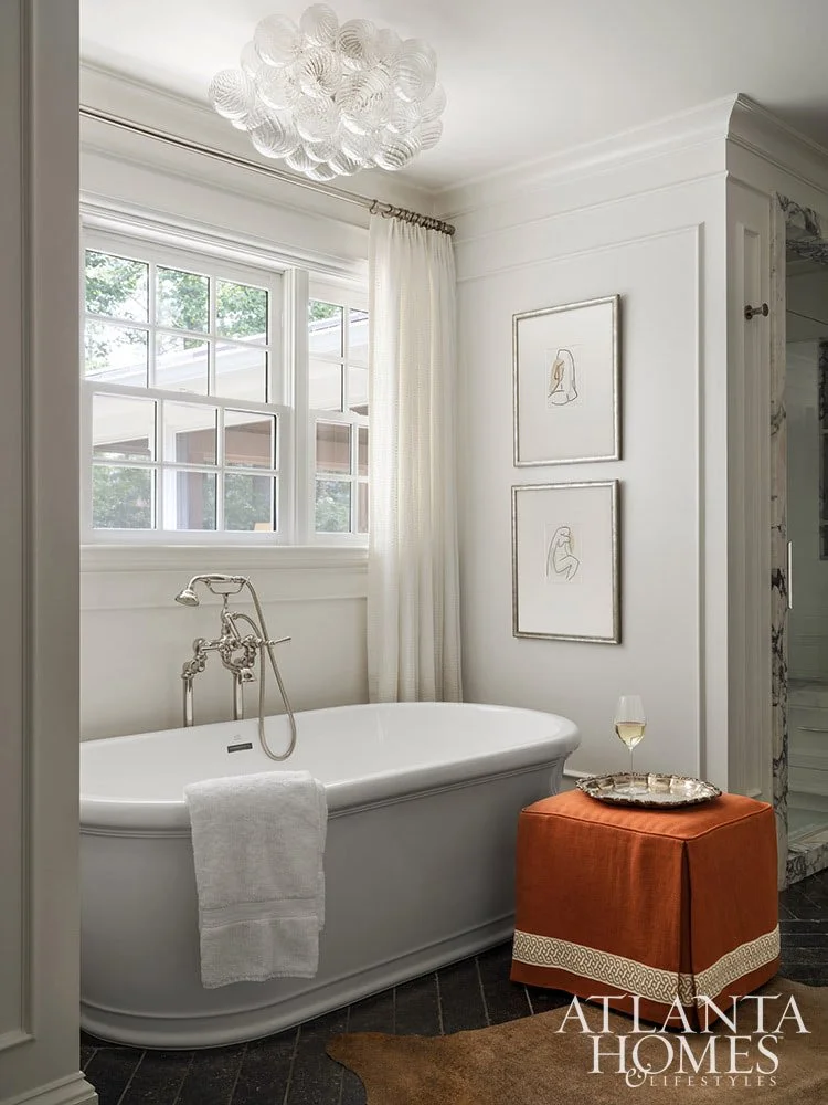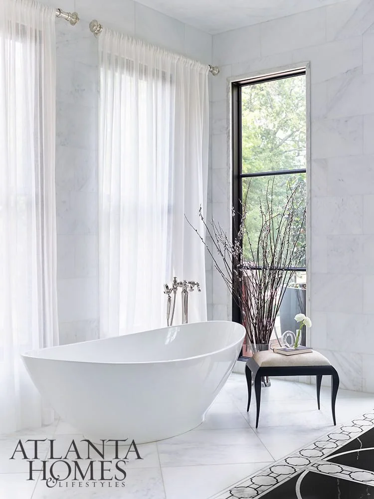 As part of an overall transformation of an Atlanta home into a transitional stunner, mother-daughter duo Jane and Hillary Hollman approached the primary bathroom with one leading star in mind: an expansive shower that’s a marble masterpiece. “We wanted to capitalize on the big shower, while creating interest and comfort,” says Jane, principal designer and founder of Studio Entourage, who adds: “The bathroom had tall ceilings and big spaces, but the homeowners desired intimacy and a welcoming sense of space.”