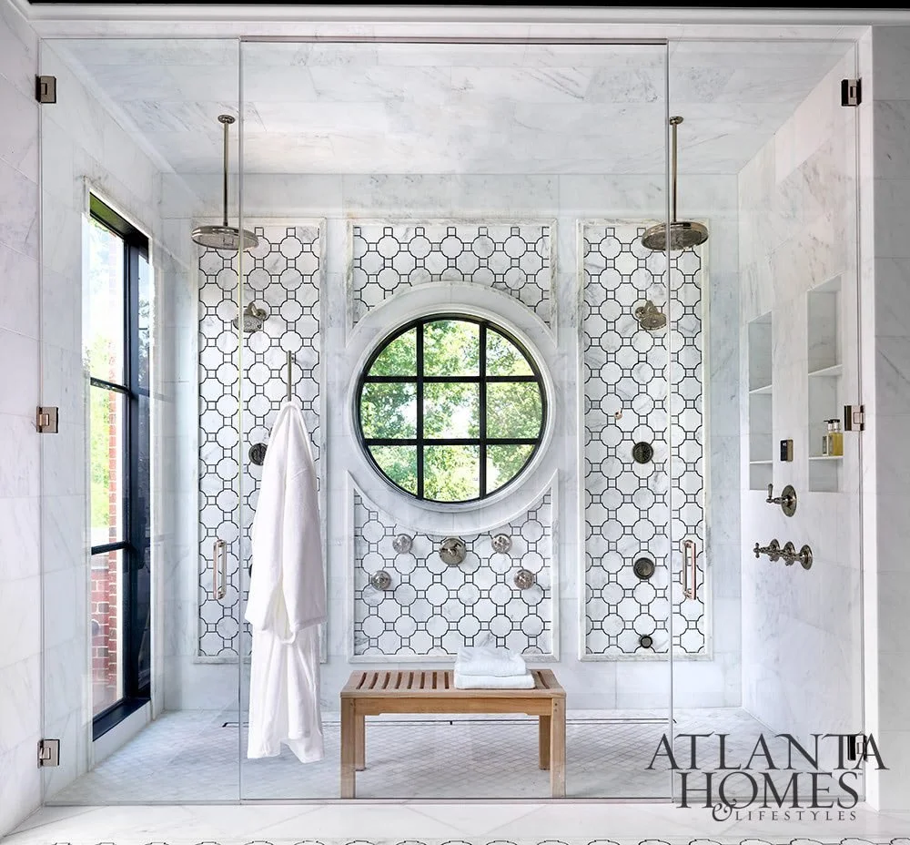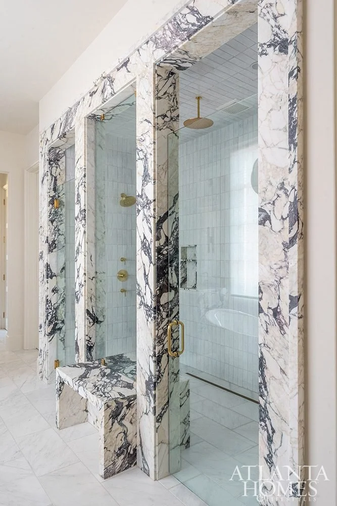 While bathtubs usually snag the starring role, it’s a marble-encased shower that steals the show in this Atlanta bathroom by Studio Entourage.