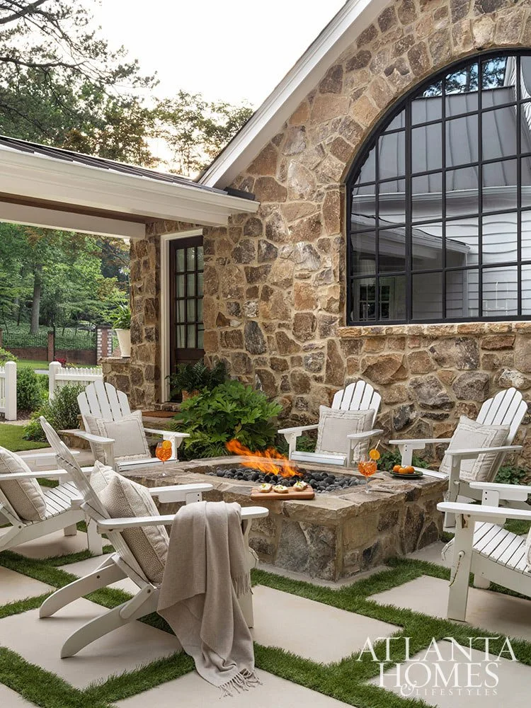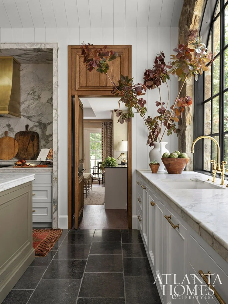 For the decor, Hollman took the same approach she uses with clients. “I asked myself what aesthetic I wanted,” she says. “I’d describe our style as Blackberry Farm meets fresh Atlanta traditional.” The top priority? “A kitchen with a tall ceiling and that beautiful Tennessee fieldstone as an end wall.” Belgian bluestone flooring in that room—a departure from the hardwood floors found throughout—adds to the grounded farmhouse feel.