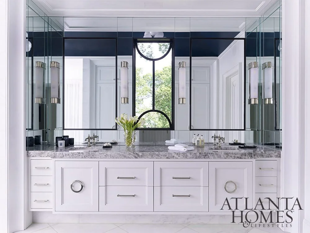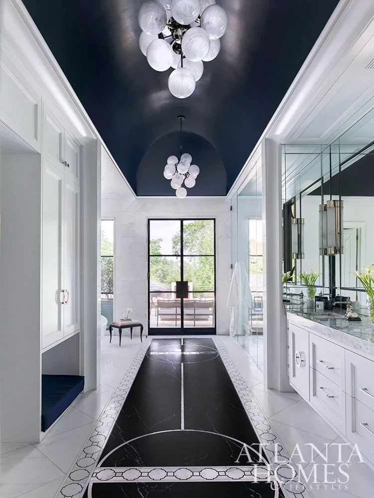 Detailed symmetry and a contrasting palette of white, black and dark blue infuse this primary bath with a “Santorini-gone-moody feel,” says Studio Entourage’s Jane Hollman, who worked alongside designer Jennelle Derricotte of Specialized Interior Design, architect Linda MacArthur, cabinetry maker Keystone Millworks and builder Michael Ladisic on the Ansley Park renovation.