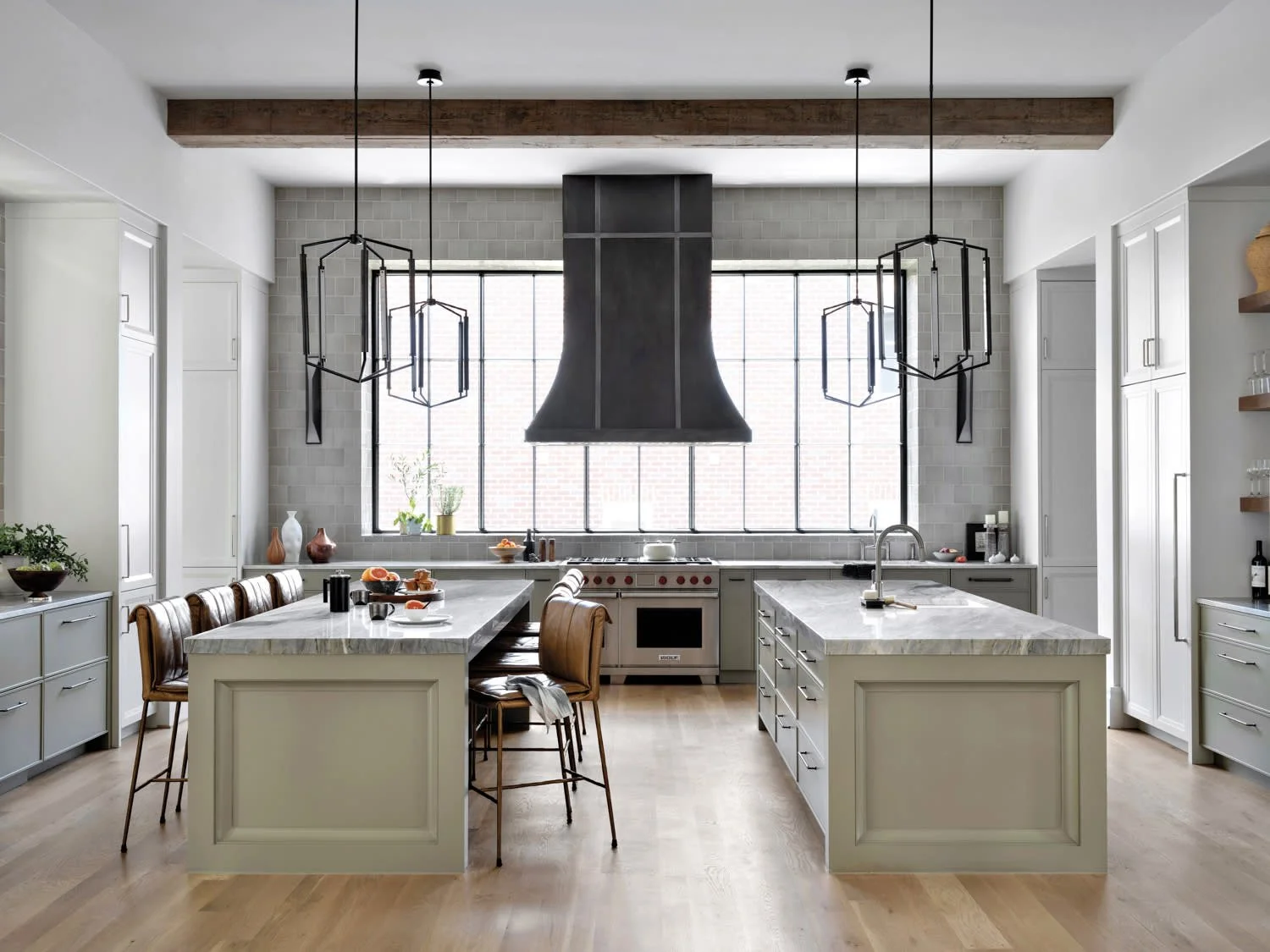 From there, the team created a dramatic focal point with steel window composition surrounding a pewter hood and Statuario Corchia marble backsplash. “We wanted to have the focal point on that range wall be super special,” says Hollman, who implemented functional details throughout.